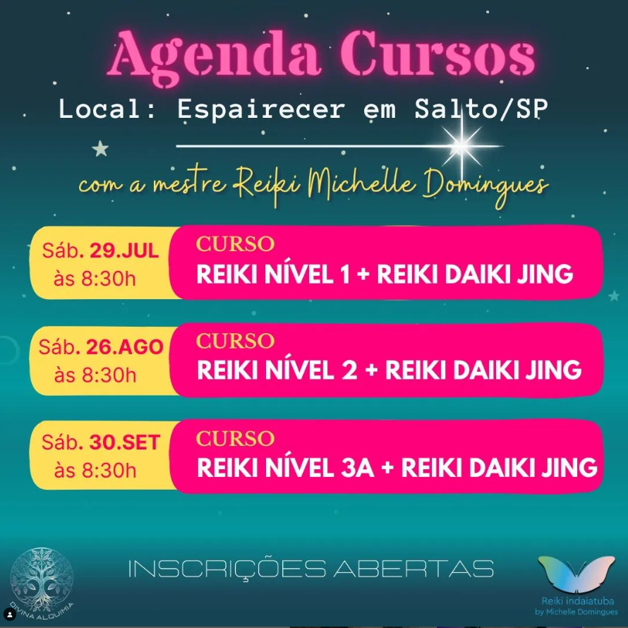 Agenda dos próximos Cursos de Reiki com a terapeuta holística e mestre Reiki Michelle Domingues na cidade de Salto